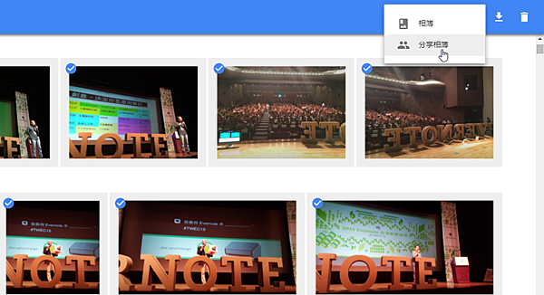 1.打開你的Google相簿網頁版,或是更新你的Google相簿 App ,然後進入某一個分類相簿中,這時候點選這個相簿分類右上方的[分享按鈕]。